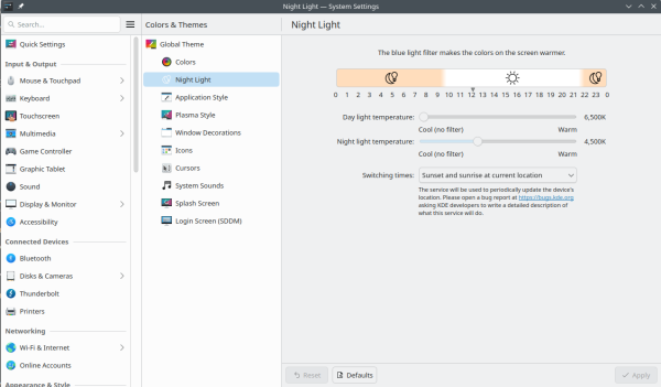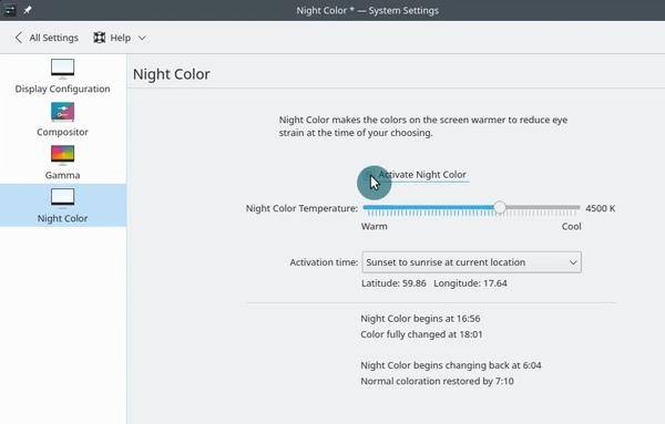 رنگ شب میزان نور آبی در شب را کاهش می دهد. این برای چشمان شما بهتر است و به شما کمک می کند راحت تر به خواب بروید. Night Color یک ویژگی داخلی دسکتاپ Plasma 5 است و فقط باید فعال شود: