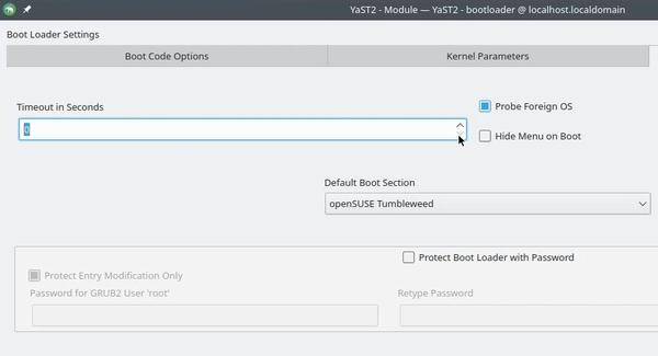 Yast → Boot Loader → Bootloader Options → Set timeout to 0 → OK