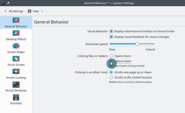Plasma 5 به طور پیش فرض فایل ها/پوشه ها را با یک کلیک باز می کند. با این حال، اکثر مردم (از جمله من) دوبار کلیک را ترجیح می دهند که می تواند در تنظیمات فعال شود.